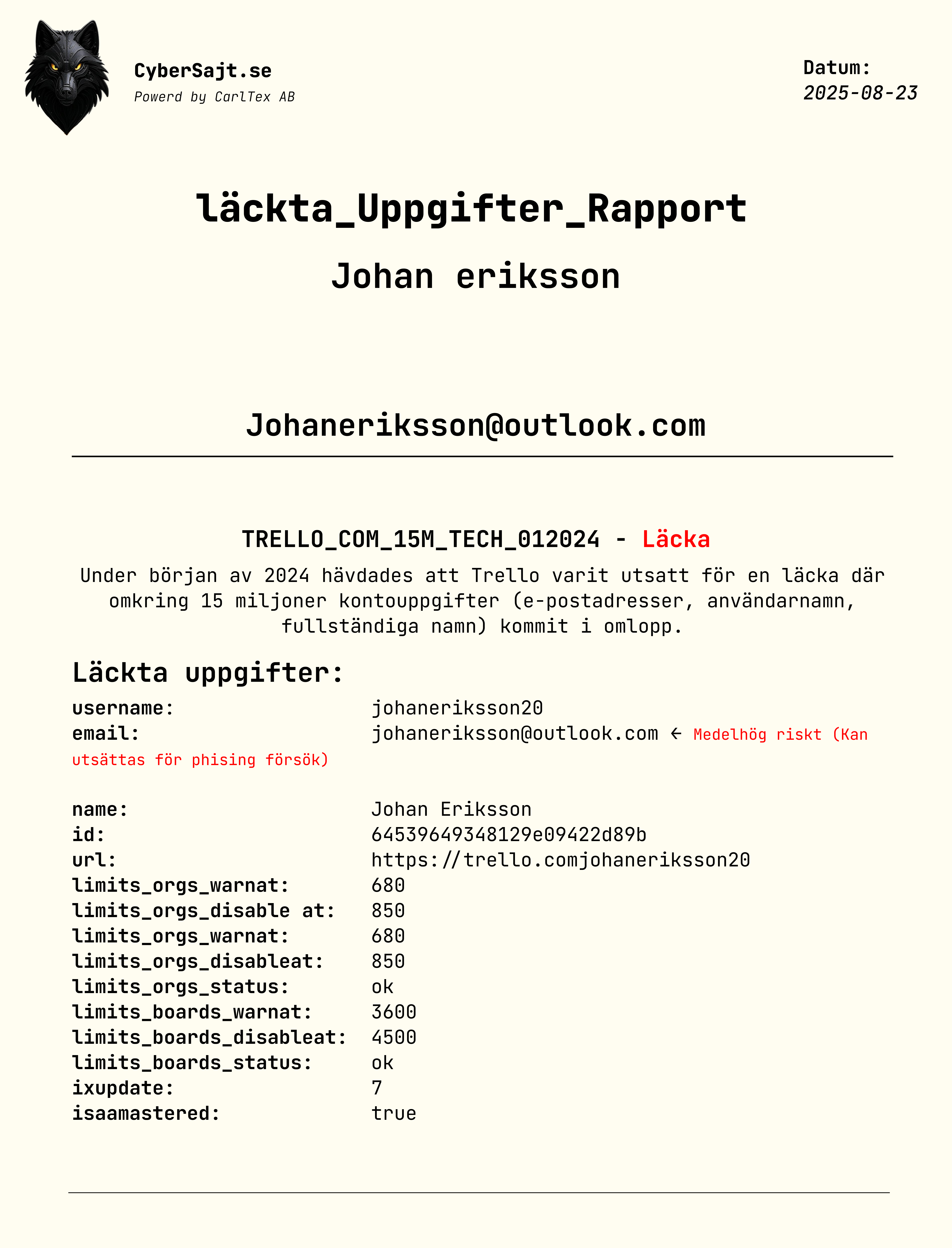 Din rapport innehåller: Detaljerad information om alla hittade läckor, risknivåbedömning och konkreta noteringar för att skydda dig.